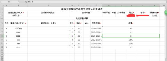 下载外校成绩导入模板以后,请将界面的交流院校、姓名、学号、课程修改,重新录入个人真实成绩,下载的文件中的数据只是示例。“课程名称(外语)”栏国际交流的学生必须填写,国内交流的学生可不填写。