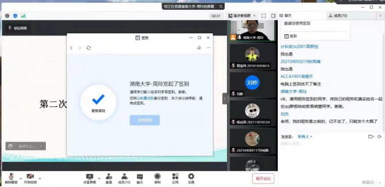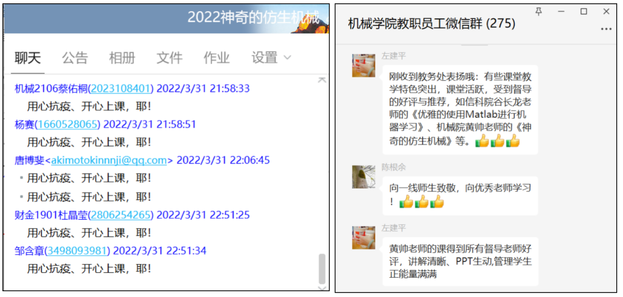 虽然不能像线下课堂一样直观感受学生反馈,但结合时事素材的环节后能明显感受到同学们的情绪被渐渐调动起来,互动效果远超以往。33名同学的课堂,有约50%的同学参与了语音互动,还有200余条弹幕和聊天互动。课后,黄帅老师还组织同学们发起了“用心抗疫、开心上课”的接龙,使课堂内外更加具有连贯性。校督导团老师对此作出了“讲解清晰、课堂生动、正能量满满”的评价。