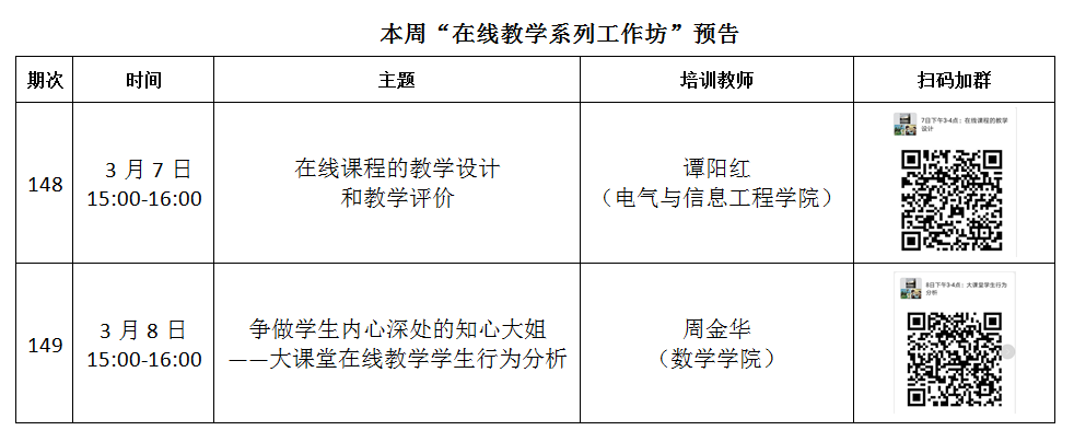 此时此刻,不要忘记你们的亲密战友——教师教学发展中心,为纵深推进在线教学,我们将陆续推出一系列在线教学的深入探讨,主题包括“在线教学课程教学设计”、“在线教学课堂互动”、“在线教学学习者行为分析”、“在线教学教学评价”等,以下就是本周末的两场工作坊信息(点击下图放大),教学工作坊期待您的加入!