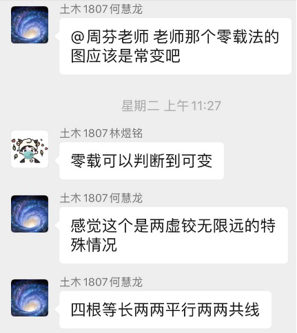 记得第一次小班讨论课上,我给同学们做了一个拓展:对于复杂杆系的几何组成分析,如利用刚片规则有困难,可以考虑零载法。然后介绍了零载法的应用及限制条件,讲解例题。课后同学们还饶有兴趣地在微信群刨根问底,一定要用刚片规则对例题再次确定结论。