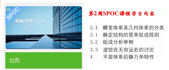 我利用土木工程学院已经上线的结构力学慕课,建立同步SPOC,每周发布教学公告,鼓励同学们利用业余时间完成预习任务,不懂就问。