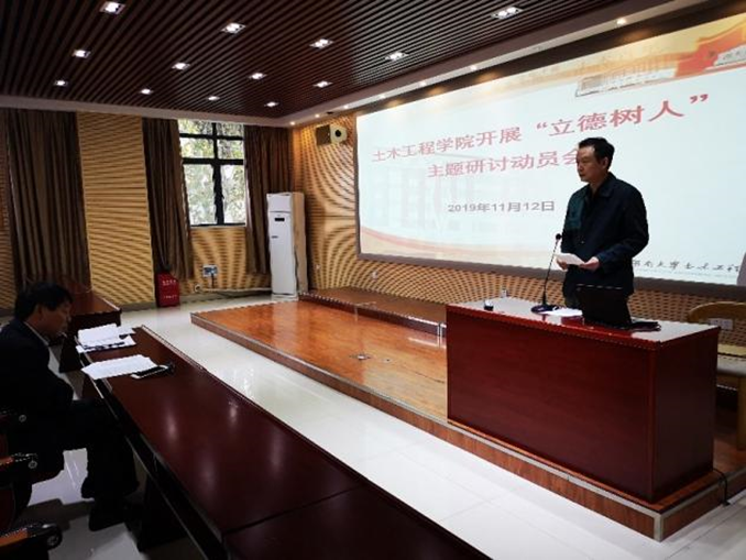 开展“立德树人”主题研讨活动。在学院党委的领导下,组织近四年引进的青年教师,围绕“立德树人”的主题系统地开展了调研和探讨。2019年11月26日,学院部署开展集中讨论。教师代表周石庆副教授、吴若希副教授和罗伊默教授分别做题为《国内高校土木学科本科培养方案及特色调研》《土木工程学院“立德树人”主题研讨》和《高校“立德树人”主题研讨汇报》的汇报。